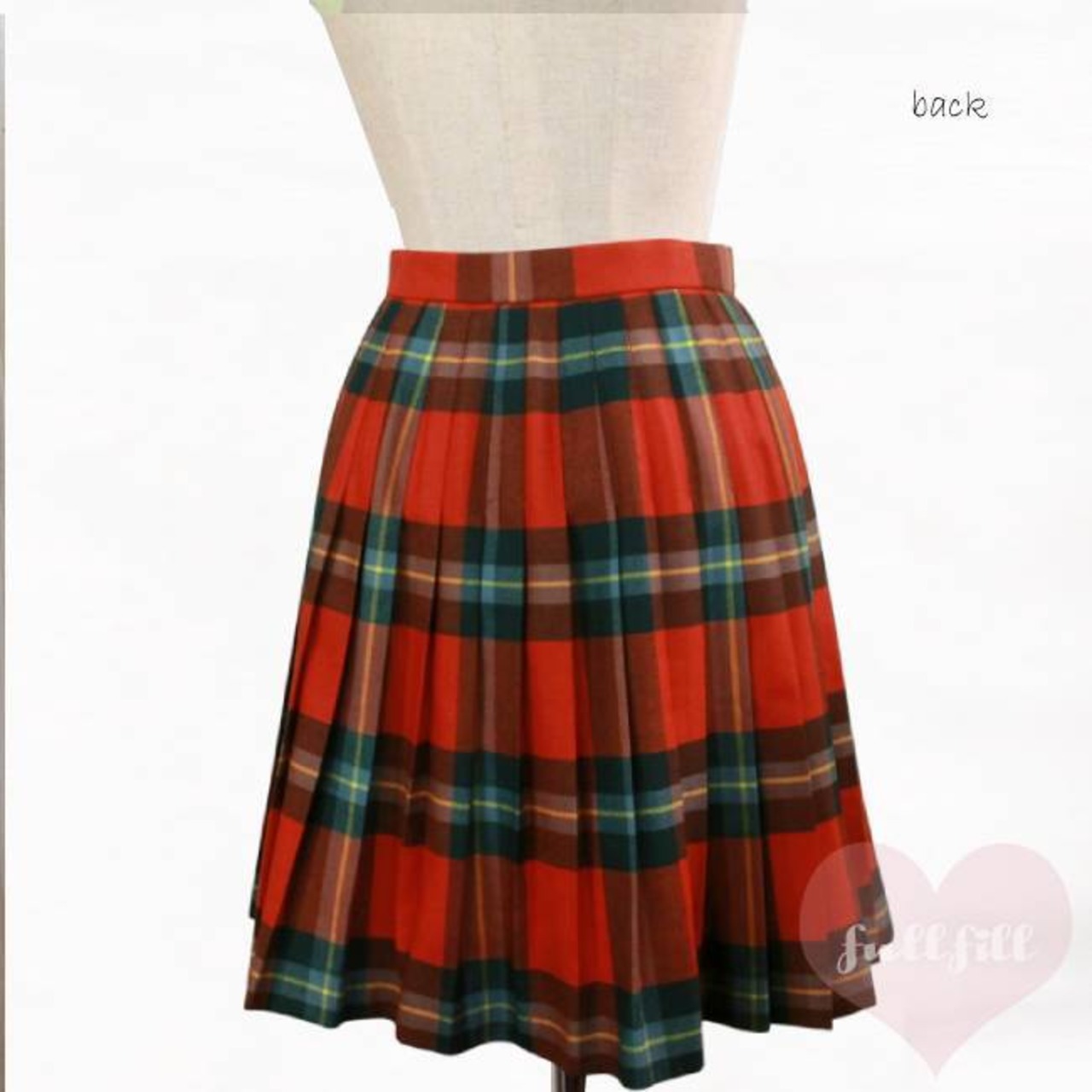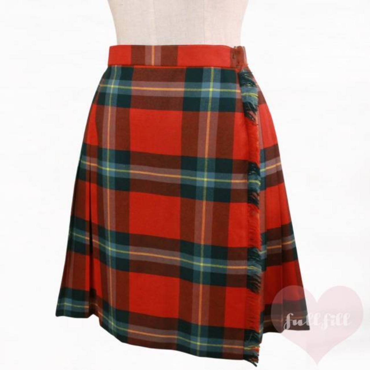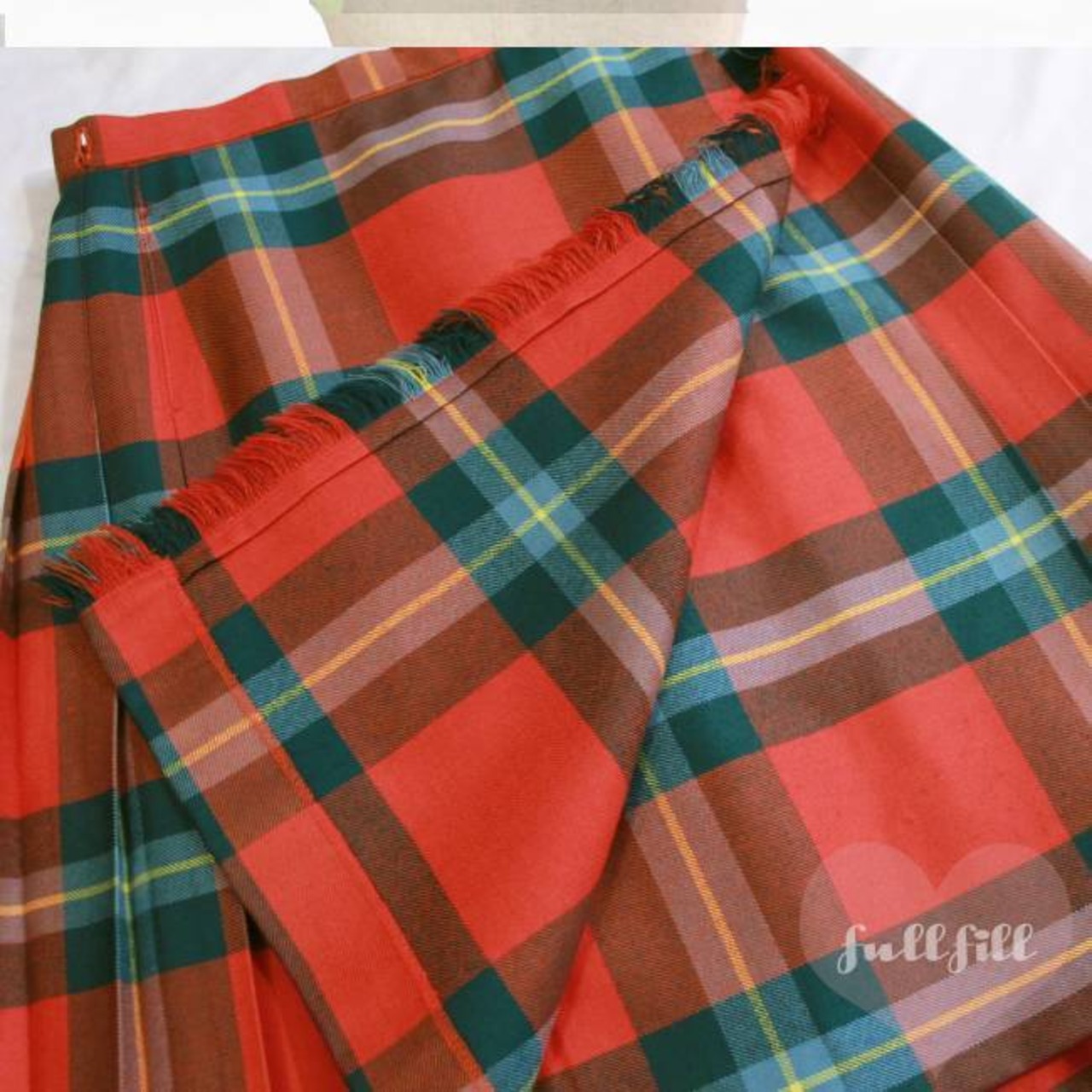 赤×グリーンベースのチェック柄プリーツラッフルスカート。