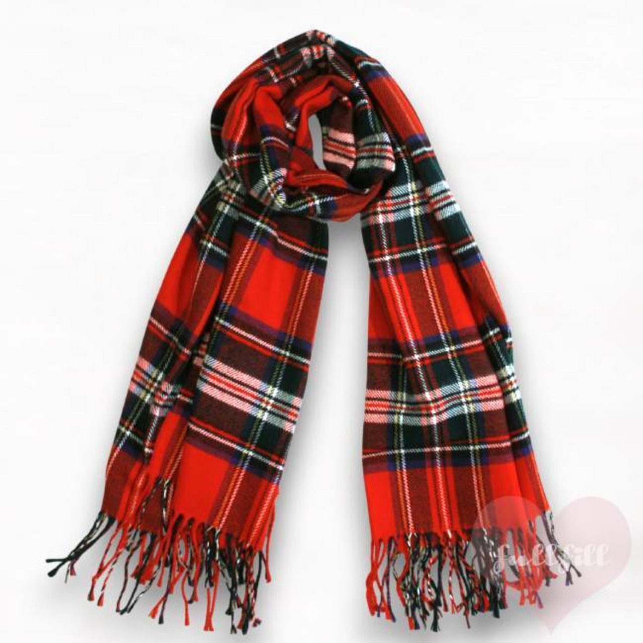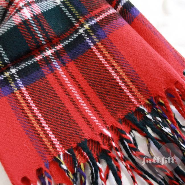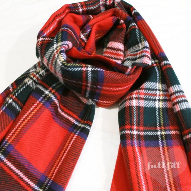 冬の定番、赤系タータンチェック柄の大判マフラー。