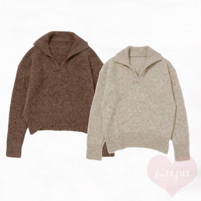 ふわふわ襟付きVネックニット スキッパー レディース 秋冬 トレンド やわらか 長袖 セータ