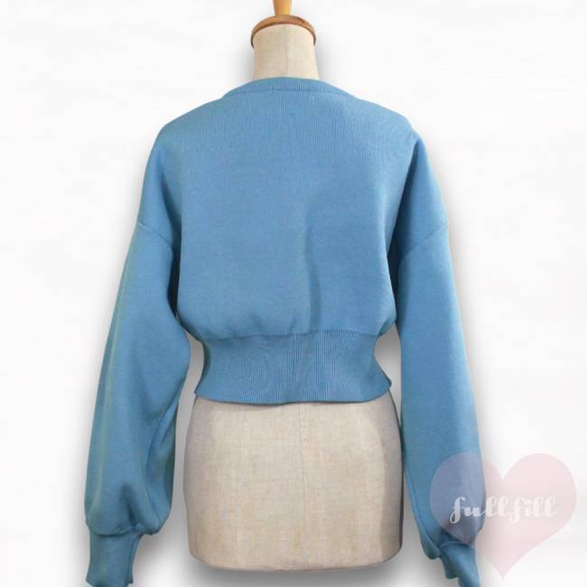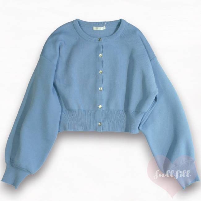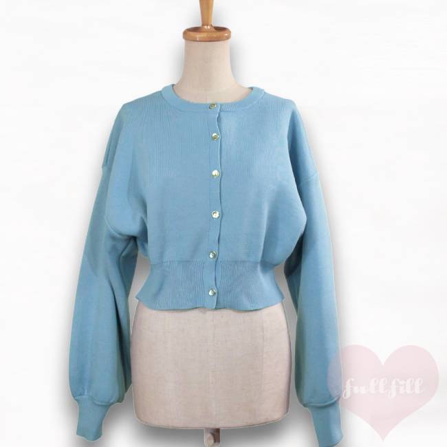 ボリューム袖 ショート丈 ライトブルー長袖カーディガン 古着
