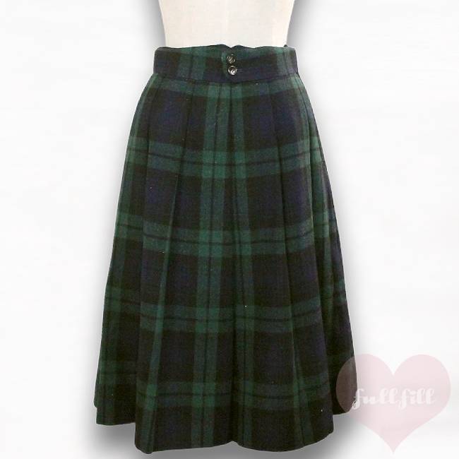ベルト付き グリーン×ネイビーチェック柄 ウールプリーツスカート 古着