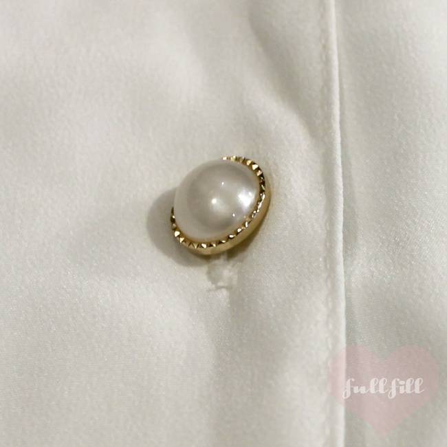 ふんわりとしたシルエットに、パールボタンと細かなプリーツをあしらった