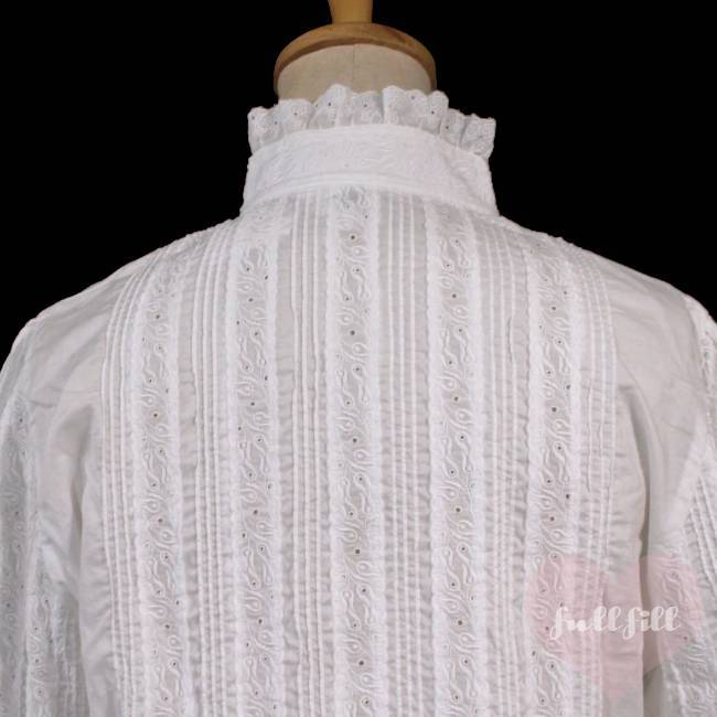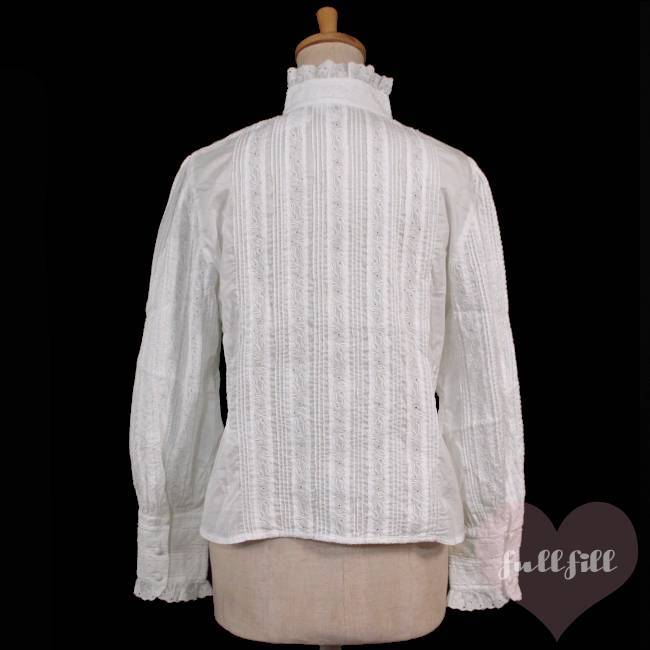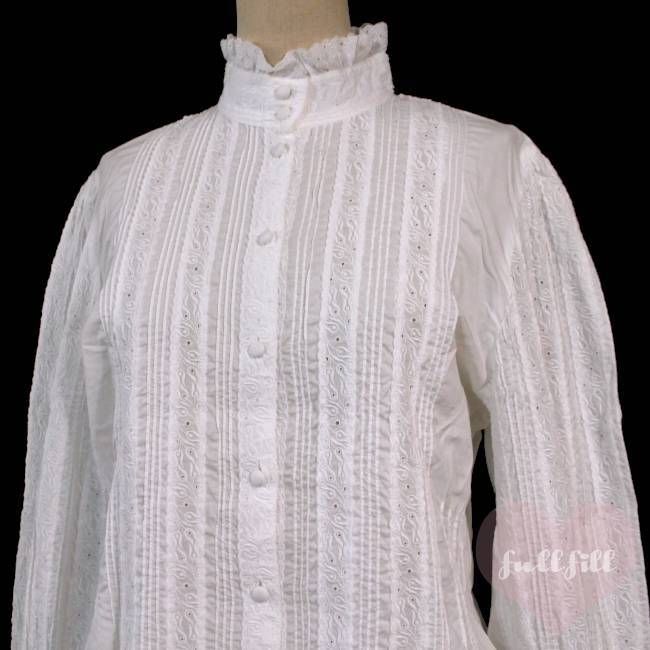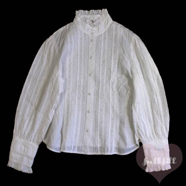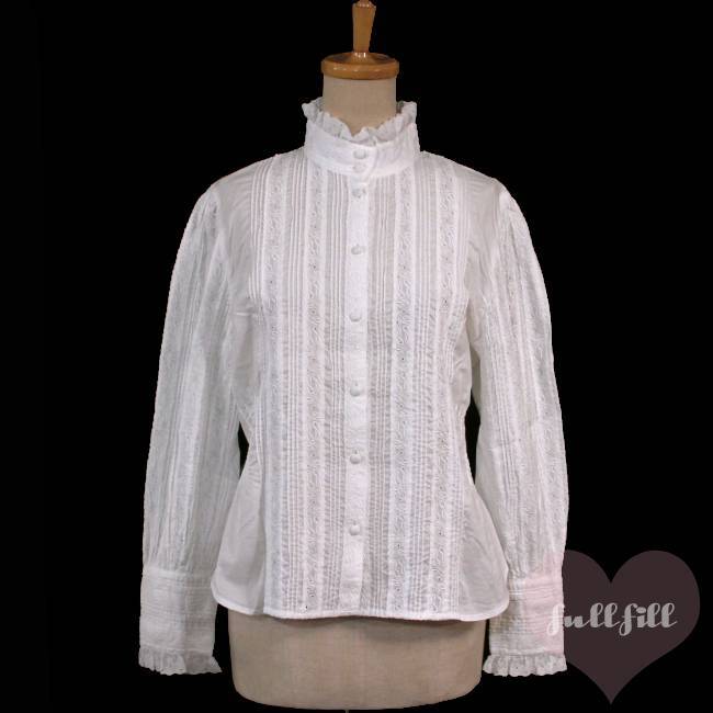 レースハイネック&総ピンタック クラシカルホワイトブラウス 古着