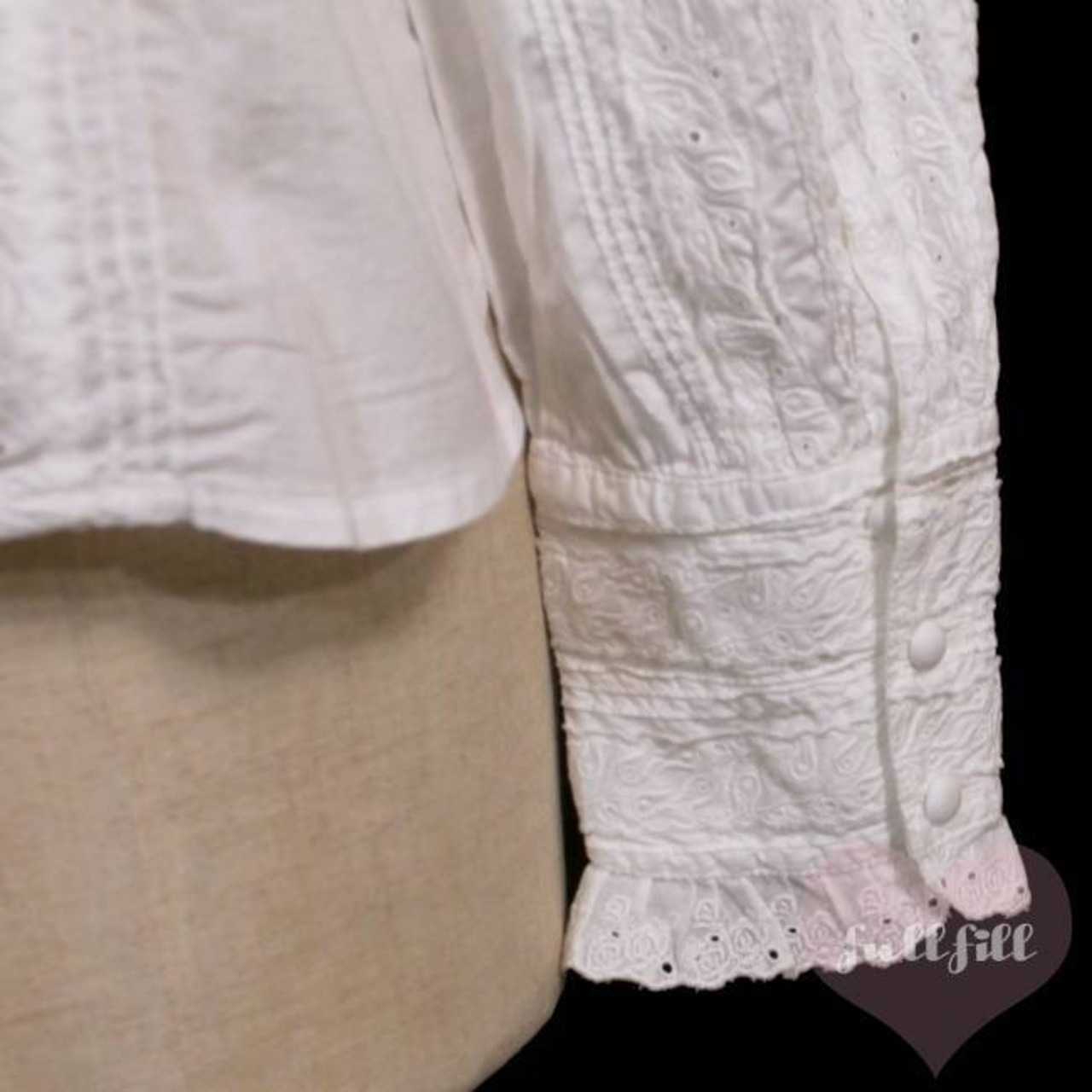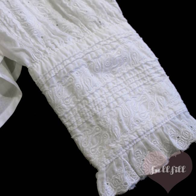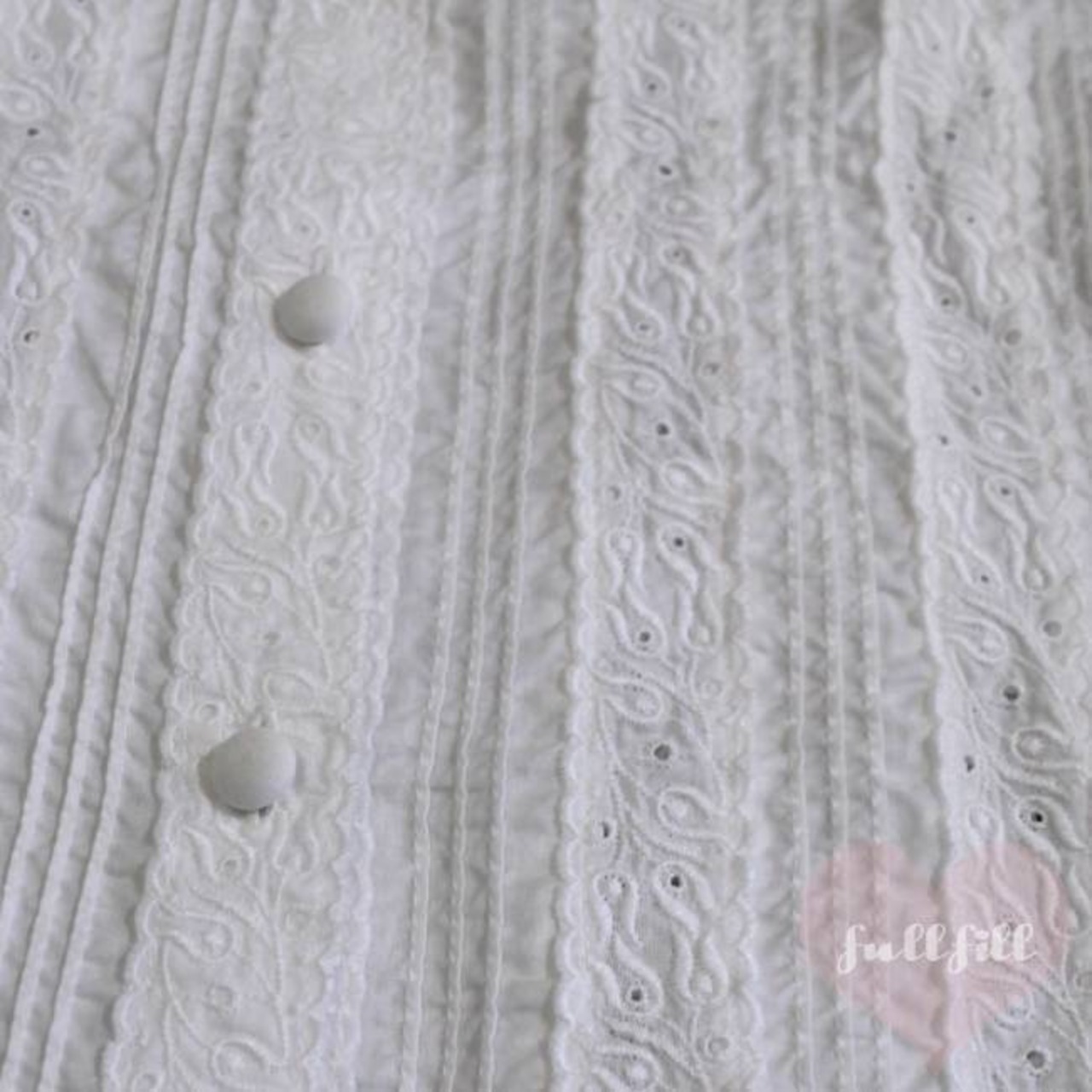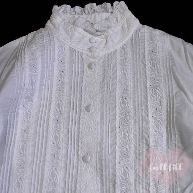 繊細なレース刺繍と、フロントに施されたピンタックが目を惹く