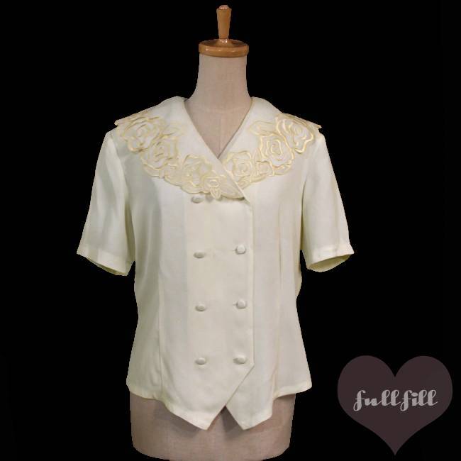 薔薇刺繍が咲くエレガントクリームダブルボタンブラウス 古着 ヴィンテージ