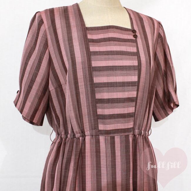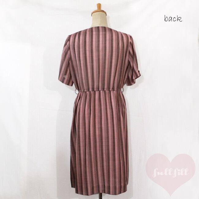 ピンクブラウン ストライプ×ボーダー半袖ワンピース 古着