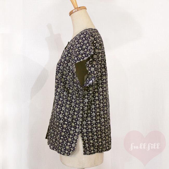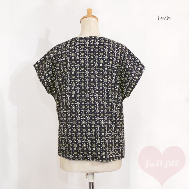 ネイビーにカーキ系のレトロ柄ブラウス。