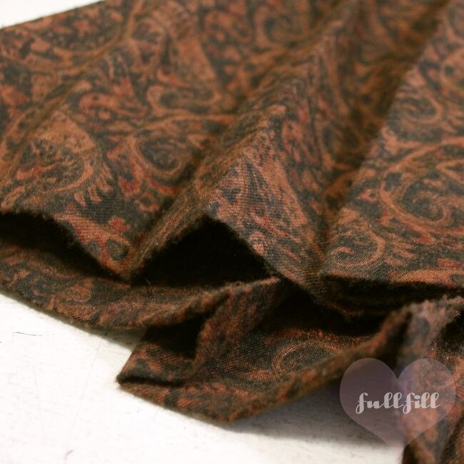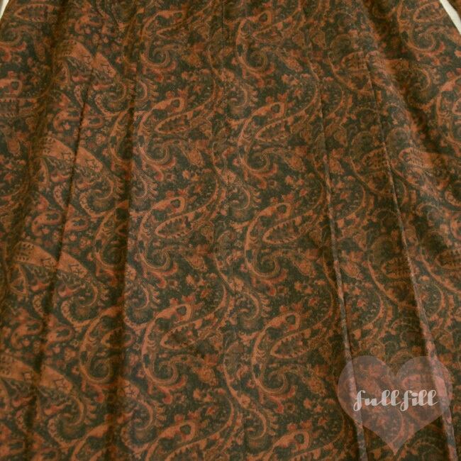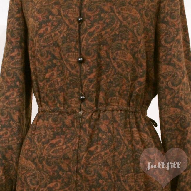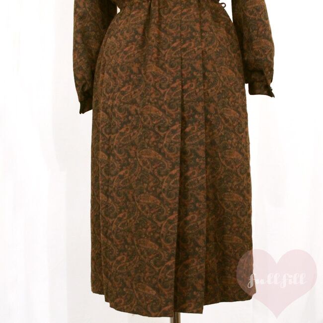赤味のあるダークブラウンのシックなペイズリー柄長袖ワンピース。