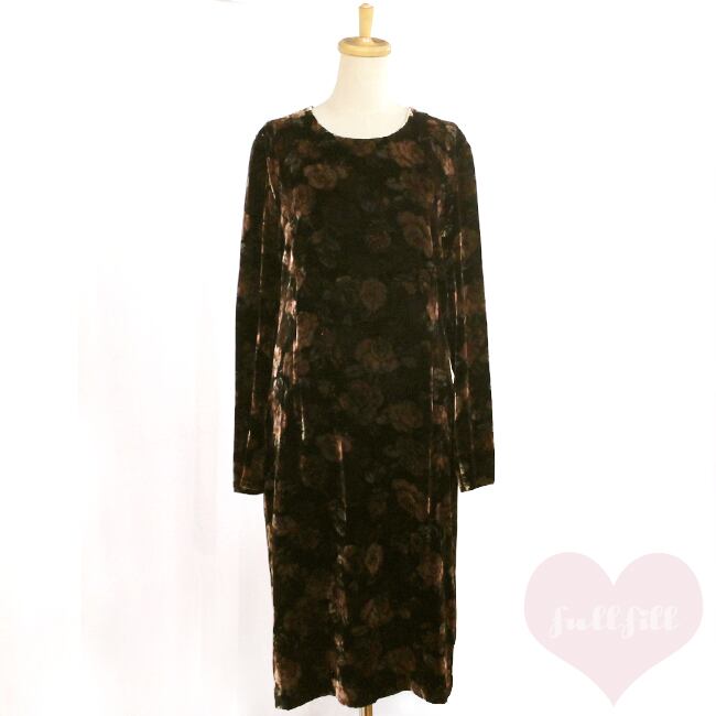 ブラック×ブラウン 薔薇柄 ベロア 長袖 ワンピース 古着