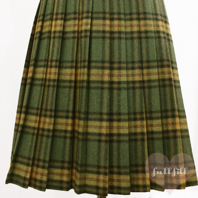 グリーン系に黄土色の秋カラーが際立つチェック柄プリーツスカート。