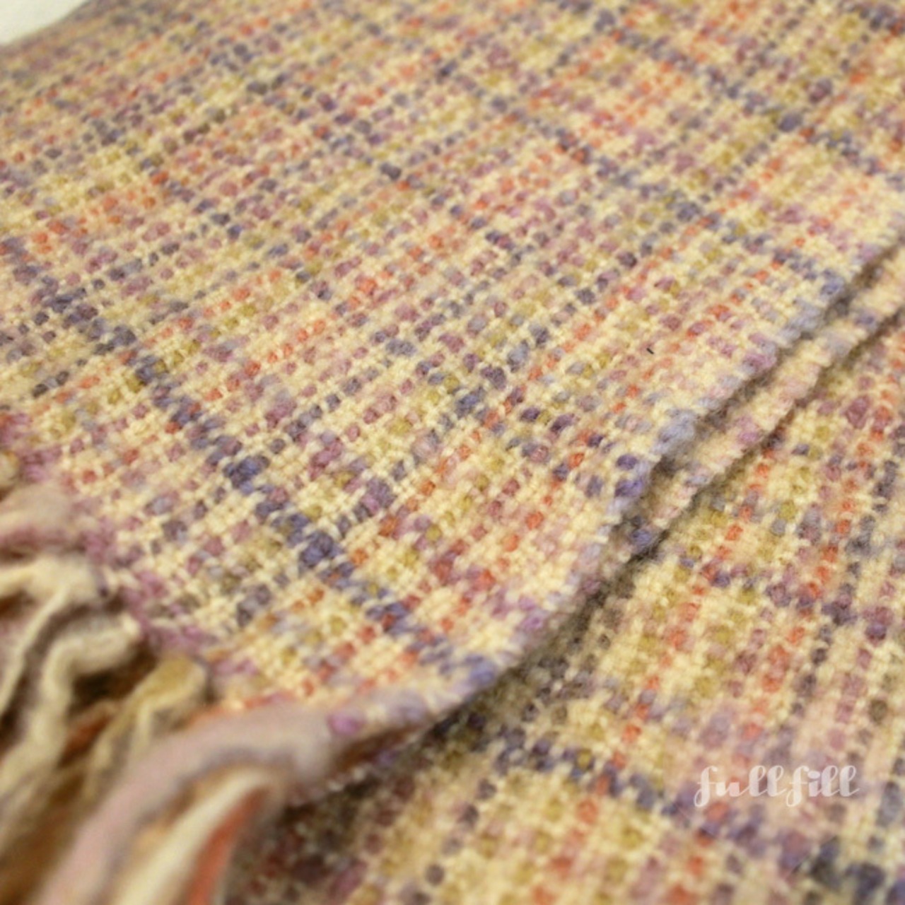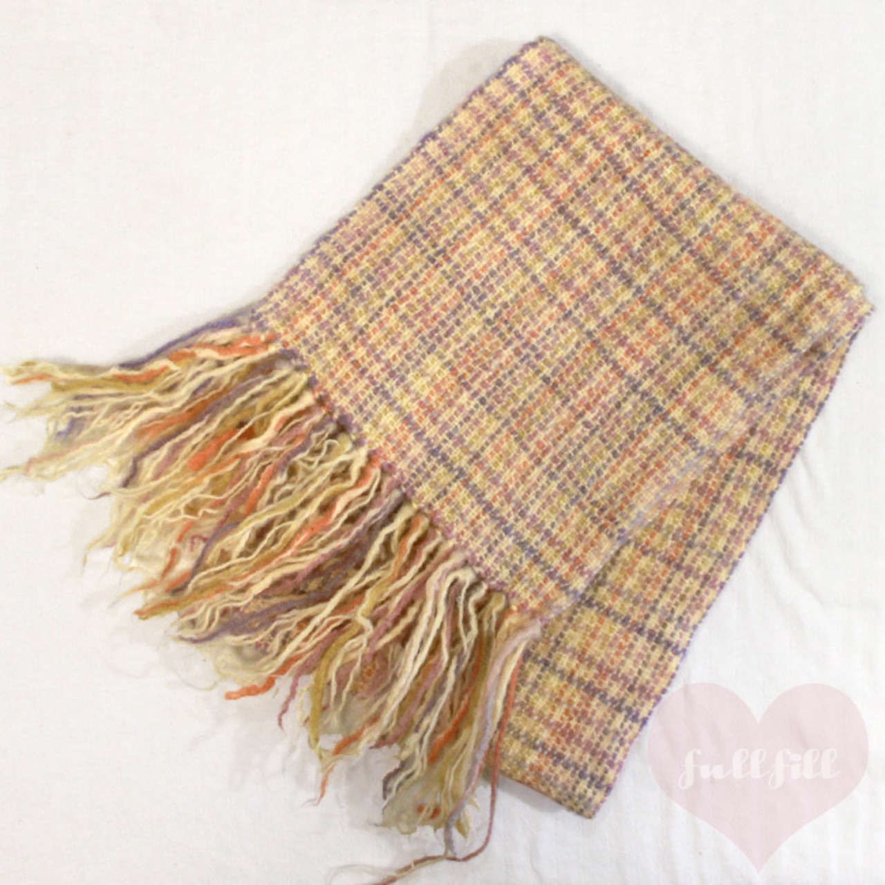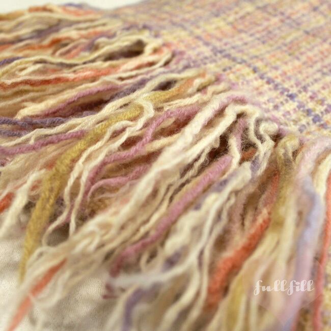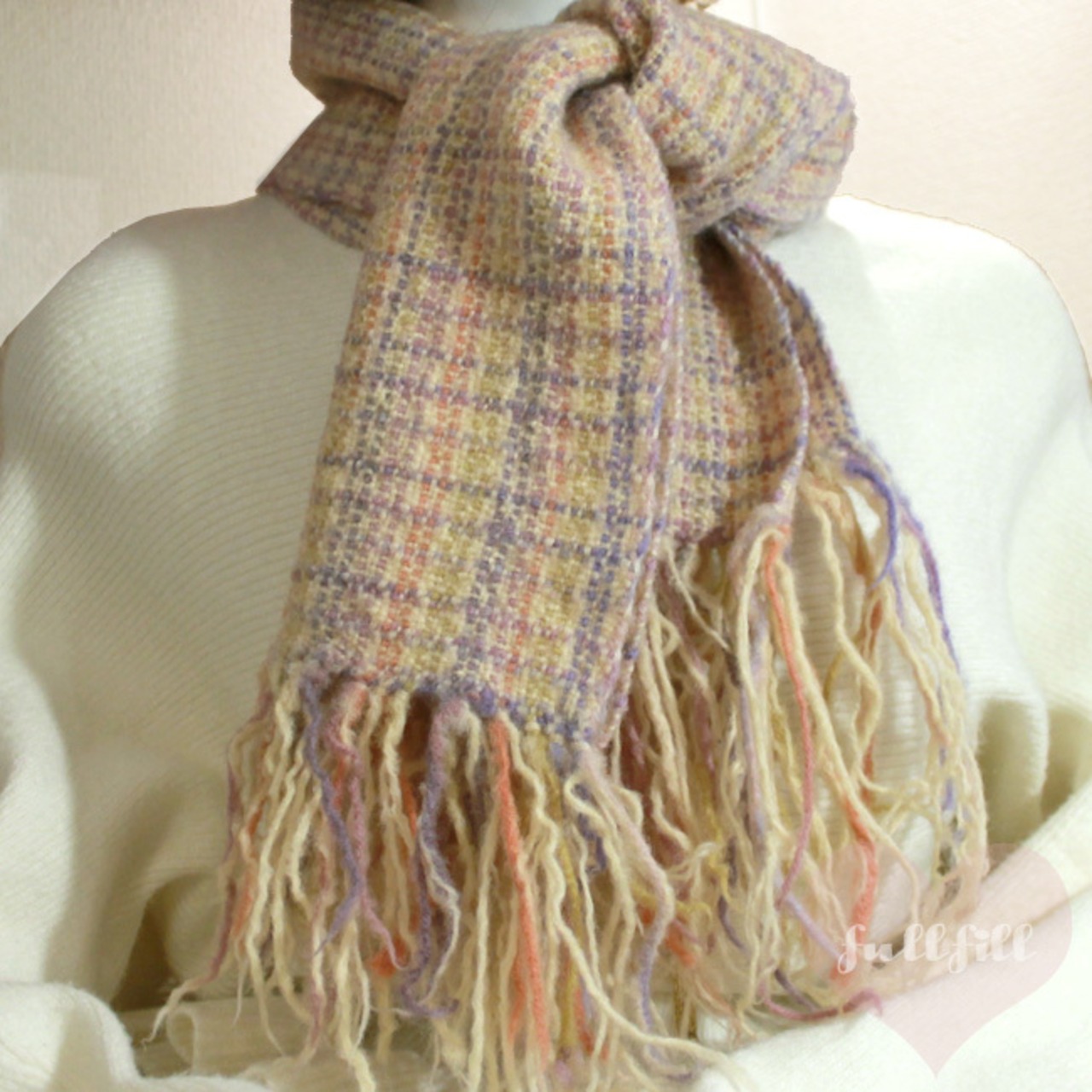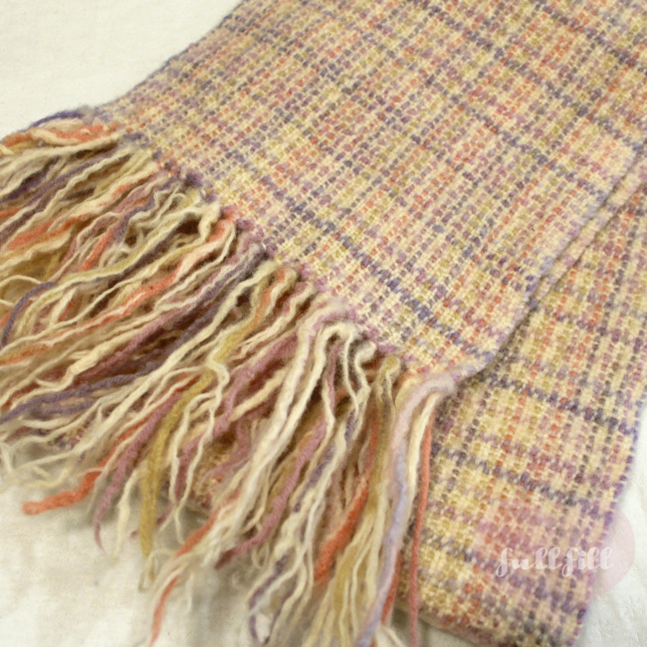 ベージュ、パープル、サーモンピンク、グリーンなどのミッスクカラーが素敵なマフラー。